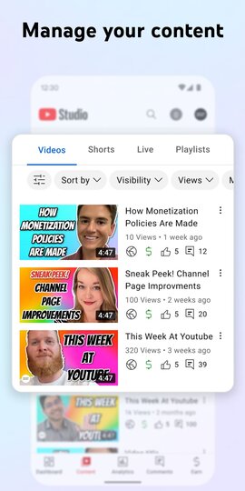 π YouTube Studio offers a comprehensive suite of tools to simplify the content creation and management process. Creators can upload and edit videos directly from the app, adding titles, descriptions, and thumbnails to make their content stand out. The analytics section provides valuable insights into video performance, audience demographics, and revenue data, allowing creators to fine-tune their content strategy. Engaging with your audience is made easy with real-time comments and notifications. You can also "download YouTube Studio" for on-the-go access to your channel's performance and audience interaction. It's your creative studio in your pocket! ποΈππ±